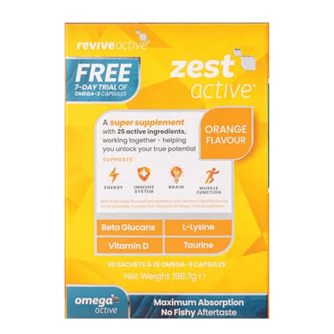 Revive Active’s Zest active is a super supplement specially formulated for adults, delivering multiple benefits in one easy sachet. A powerful and innovative supplement that fuses functional ingredients to take into and unlock your potential, naturally. Suitable or vegans, vegetarians and those following a gluten-free diet, Zest Active is an easy-to-take supplement with a refreshing orange flavour.